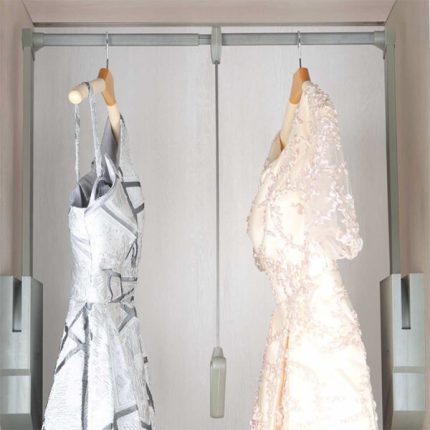 Móc treo quần áo đa năng được lắp mặt trên thành tủ đi kèm ray giảm chấn giảm tiếng ồn khi kéo, với bộ ray trượt êm ái này khi treo quần áo chỉ cần kéo nhẹ là sản phẩm sẽ trượt theo ray ra ngoài tủ từ đó ta có thể dễ dàng quan sát và lấy đồ mình cần. Và cũng chỉ cần đẩy nhẹ thì chức năng giảm chấn sẽ dịch chuyển chuyển móc treo vào trong.