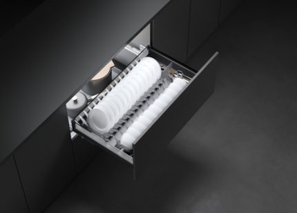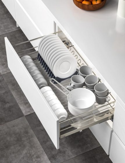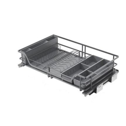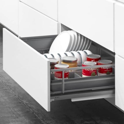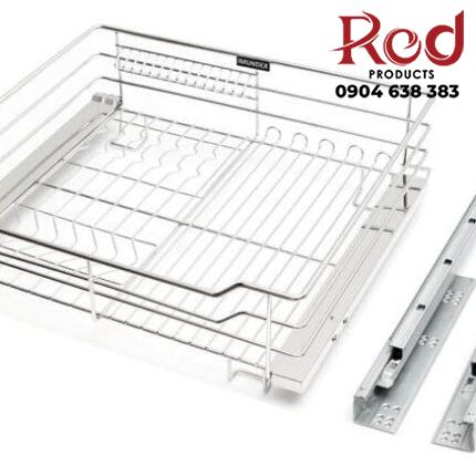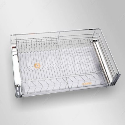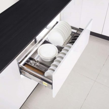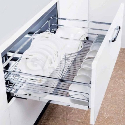 Giá xoong nồi bát đĩa inox nan lắp đặt vào cạnh thành tủ bếp với hệ thống hai bên ray trượt giảm chấn dễ dàng kéo đẩy và tự hút vào khi sử dụng nên rất tiện và thông minh.
