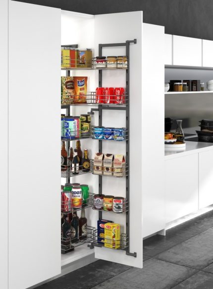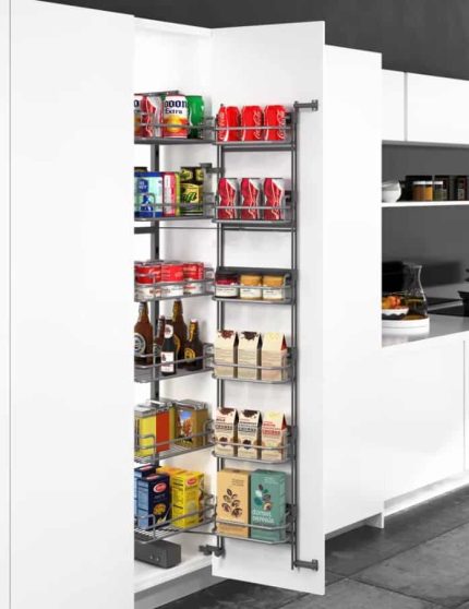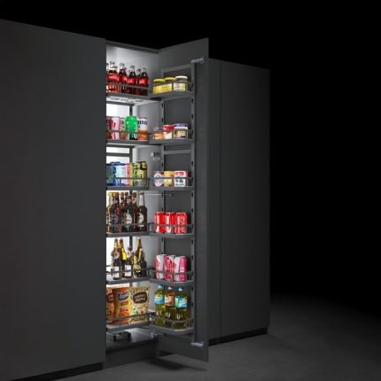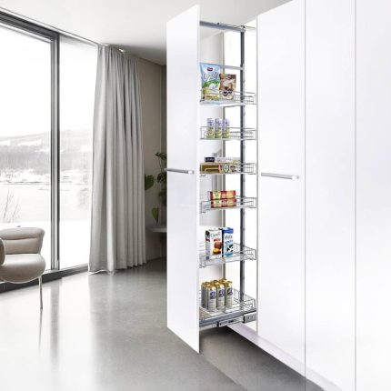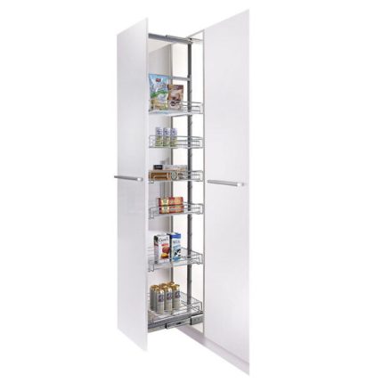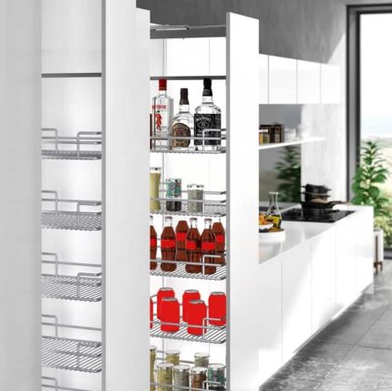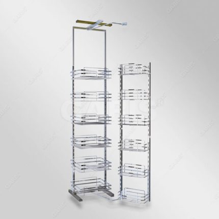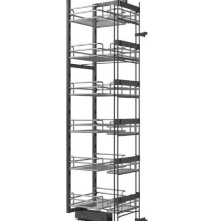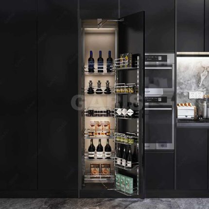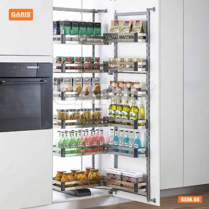 - Kết cấu 6 tầng gồm 6 sàn đựng gắn liền với cánh tủ khi kéo sẽ chuyển động một đường thẳng có thể đưa toàn bộ sàn chứa ra ngoài giúp người dùng dễ dàng lấy vật dụng cần lấy.