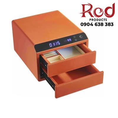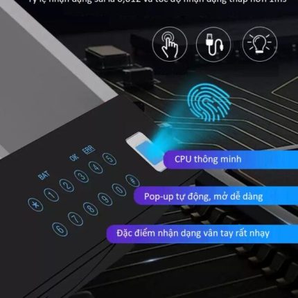 là hộp khóa độc lập tủ được trang bị khóa thông minh bằng vân tay kết hợp với cài đặt mật mã, người dùng có thể sử dụng song song hai tính năng này là mở bằng thiết lập vân tay cùng với mật mã. Hộp an toàn được chế tác ngoại thất bằng thép tấm cán nguội chắc chắn, nặng và dày, bên trong được trang bị bằng xốp chống cháy chuyên dụng cho két sắt và da thật mềm cao cấp cho phần vỏ nội thất và ngoại thất