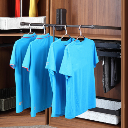 Móc treo quần áo đa năng được lắp mặt trên thành tủ đi kèm ray giảm chấn giảm tiếng ồn khi kéo, với bộ ray trượt êm ái này khi treo quần áo chỉ cần kéo nhẹ là sản phẩm sẽ trượt theo ray ra ngoài tủ từ đó ta có thể dễ dàng quan sát và lấy đồ mình cần. Và cũng chỉ cần đẩy nhẹ thì chức năng giảm chấn sẽ dịch chuyển chuyển móc treo vào trong.