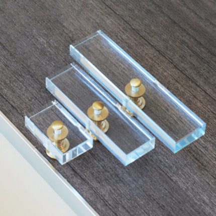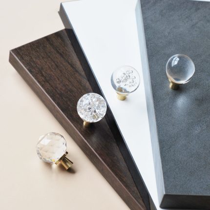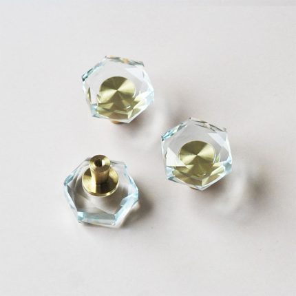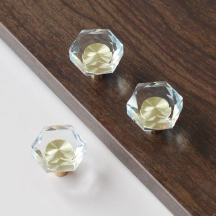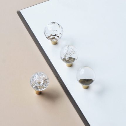 là bộ tay nắm tủ hiện đại với sự kết hợp từ pha lê và đồng nguyên chất H59. Thiết kế tuy đơn giản nhưng mang lại ấn tượng bởi màu sắc đẹp mắt, kiểu dáng pha lê hình trụ thon gọn trong suốt giúp tăng thẩm mỹ cho cánh tủ áo, tủ bếp.