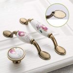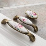 là bộ tay nắm tủ nhiều kích thước kiểu dáng khác nhau được chế tác từ vật liệu hợp kim kẽm màu vàng cổ (niken) và gốm sứ đất nung, tráng men, trang trí hình hoa. Đây là bộ tay nắm tủ cao cấp được hoàn thiện với trình độ tay nghề cao với vật liệu dày nặng và chắc chắn so với các loại tay gốm sứ khác trên thị trường