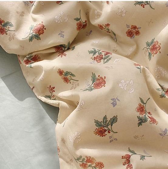 sử dụng vải cotton 100% chất lượng cao. Họa tiết hoa màu đỏ nhỏ nhắn ấm áp và mềm mại được kết hợp với màu xanh tươi mát tạo cảm giác như một vườn hoa, cả không gian bừng sáng. Để tinh tế hơn, một thiết kế diềm ren xếp nếp rộng màu trắng được thêm vào tăng thêm cảm giác bềnh bồng giữa thiên nhiên tươi mát. Chất liệu vải mềm mịn, thoải mái và ấm áp.