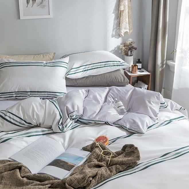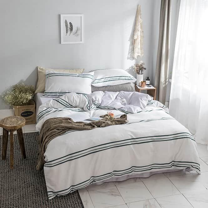 Sử dụng chất vải mềm mại của cotton cùng sự thoáng mát, an toàn cho da sản phẩm là lựa chọn hàng đầu của những gia đình trẻ. Họa tiết sọc xanh đơn giản trên nền trắng chủ đạo tạo sự thanh lịch, tươi mới giúp giấc ngủ ngon hơn. Bộ sản phẩm gồm vỏ chăn, vỏ gối và drap phủ đệm hoặc Drap chun bọc nệm.