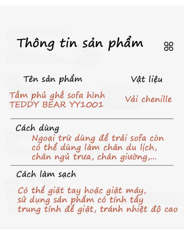 là bộ tập sưu tập vải bọc ghế sofa với nhiều kích thước, được dệt may bằng vật liệu vải chenille với nhiều màu sắc tươi mới khác nhau. Vải chenille được làm bằng sợi nhiều loại sợi khác nhau, xoắn bằng máy với hai sợi dọc xoắn xung quanh các sợi ngang nhằm tăng độ bền chắc. Chất vải đẹp và mềm mại khi sờ vào. Thông qua thêu, in và nhuộm độc đáo, sợi Chenille thường được dùng trong trang trí cao cấp, mang đến sự sang trọng cho căn phòng. Tấm phủ ghế sofa hình TEDDY BEAR YY1001 đóng vai trò bảo vệ và chống bụi bẩn cho bộ sofa nhà bạn. Vải Chenille có khả năng thấm hút tốt, hút nước mạnh, chống nhăn, chống trượt, chống mèo cào, không bóng, không phai, không co rút.